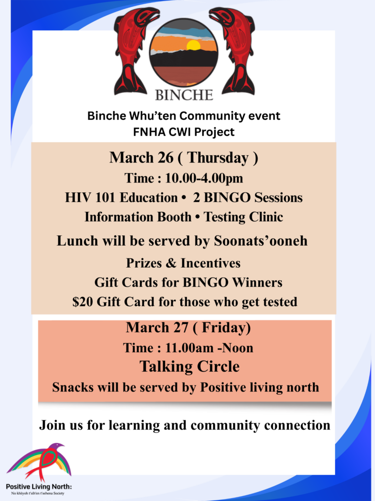FNHA CWI Project March 9, 2026 Binche Binche Whut’en Community Event. March 26 (Thurdsay)Time: 10:00am – 4:00pmMarch 27 (Friday)Time: 11am – Noon